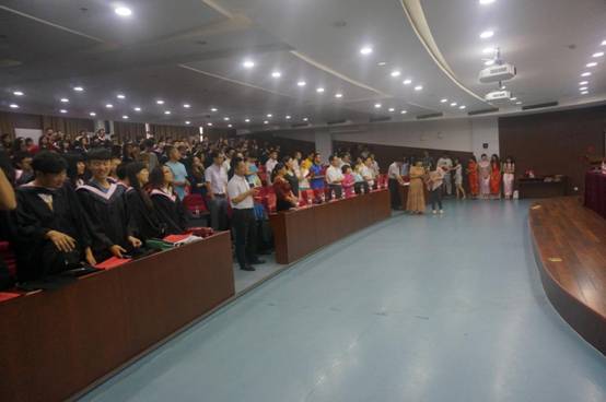 最后,毕业生合唱《歌声与祝福》、《祝你一路顺风》歌曲,主席台领导和全体老师纷纷走进同学中去,和同学们一起用歌声来回忆这大学四年、送别这美好年华。同学们挥舞着双手,深情演唱,不少同学热泪盈眶。大会在全场的歌声中完美落幕,2015届毕业生带着美好的青春回忆和厚实的专业知识奔赴社会各行各业。(拍照:何雨桐 撰稿:王张浩初审:王文婷 终审:罗金艳)