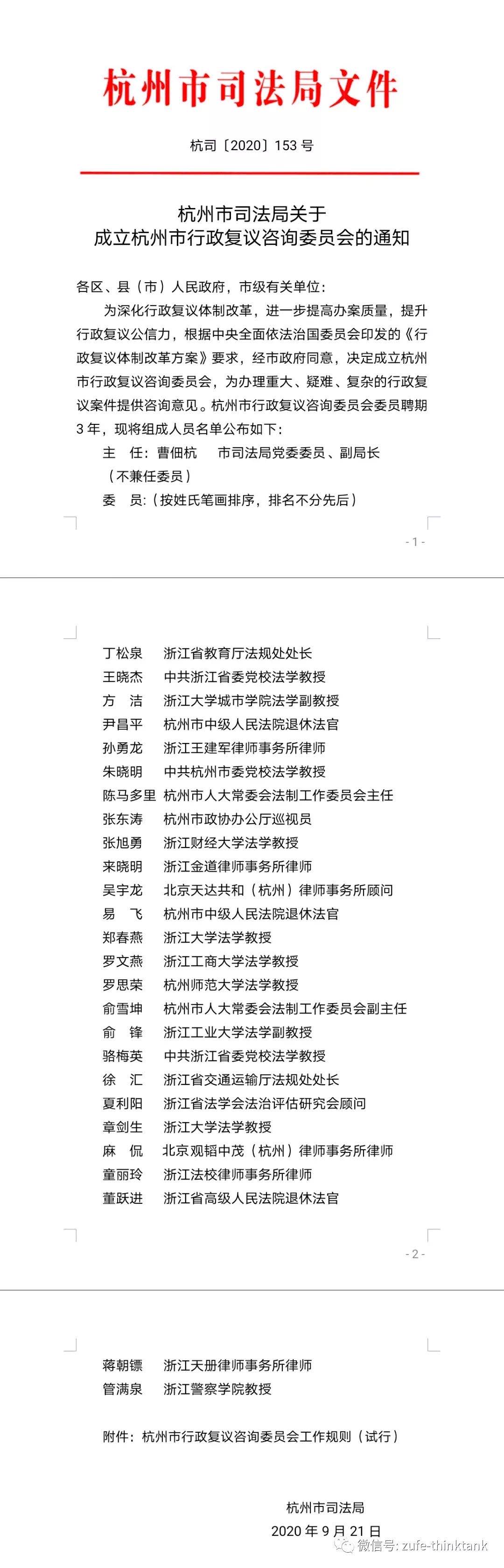 2020年9月21日,杭州市司法局印发了《关于成立杭州市行政复议咨询委员会》的通知,并公布了委员会组成人员名单。公司张旭勇教授名列其中,受聘为杭州市行政复议咨询委员会委员,聘期3年。